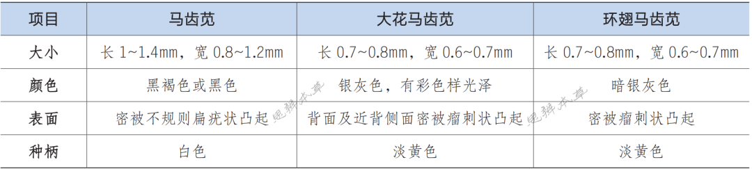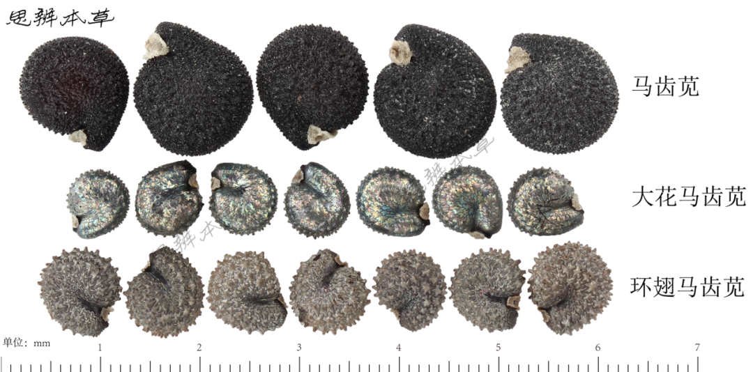 马齿苋、大花马齿苋及环翅马齿苋的种子在放大镜下容易区分,但商品流通中易混淆,尤其是在种子销售时均称之为“马齿苋”,其难点在于原植物易混淆且要把种子与原植物进行对应。在解剖镜下观察,马齿苋籽粒大,为黑褐色或黑色,表面密被不规则扁疣状凸起;大花马齿苋的籽粒较小,表面有彩色样光泽,只有背面及近背侧面有瘤刺状凸起;环翅马齿苋的种子表面暗银灰色,表面密被瘤刺状凸起。