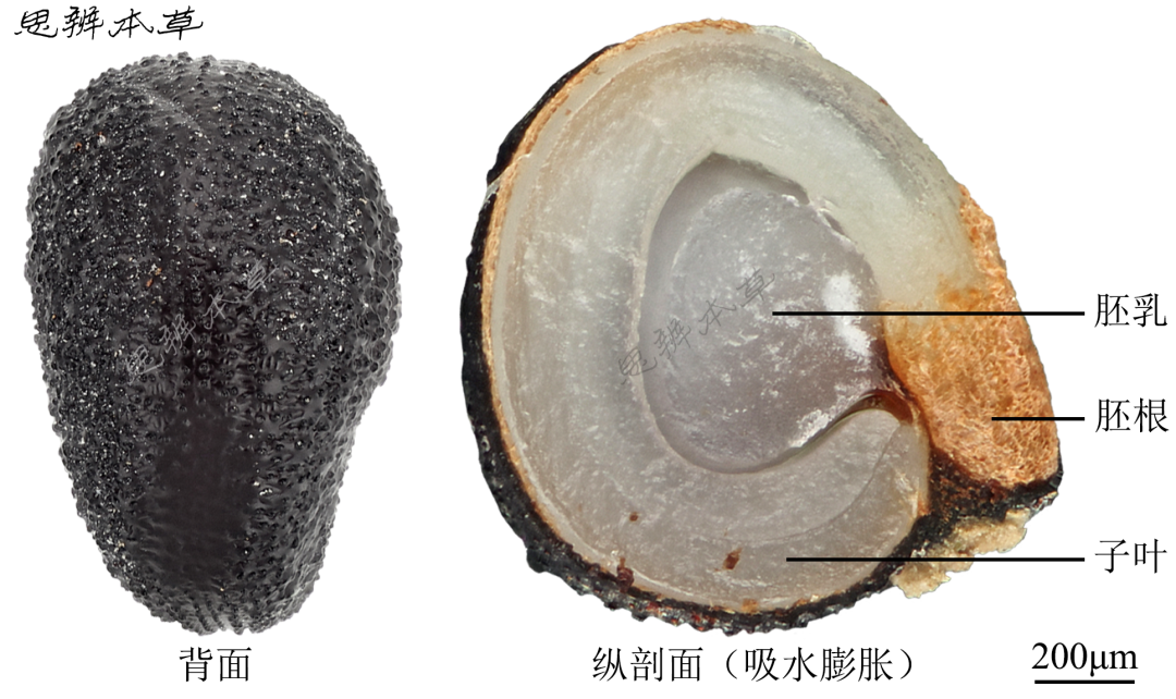细小,近肾形或三角状圆形,两侧扁,长 1~1.4mm,宽 0.8~1.2mm,黑褐色或黑色。解剖镜下观察,表面密被不规则扁疣状凸起,呈同心圆状排列,凸起的基部呈星状。背面中央有 1 或 2 列凸起较其他者小而密。种脐位于腹面基部凹陷处,灰白色;上面覆盖蝶翅状白色种柄。种皮质硬而脆。胚乳白色,半透明;胚环状,乳白色或黄褐色,环绕胚乳。千粒重 0.36g。