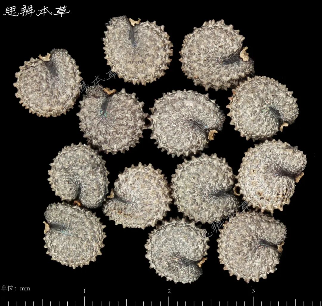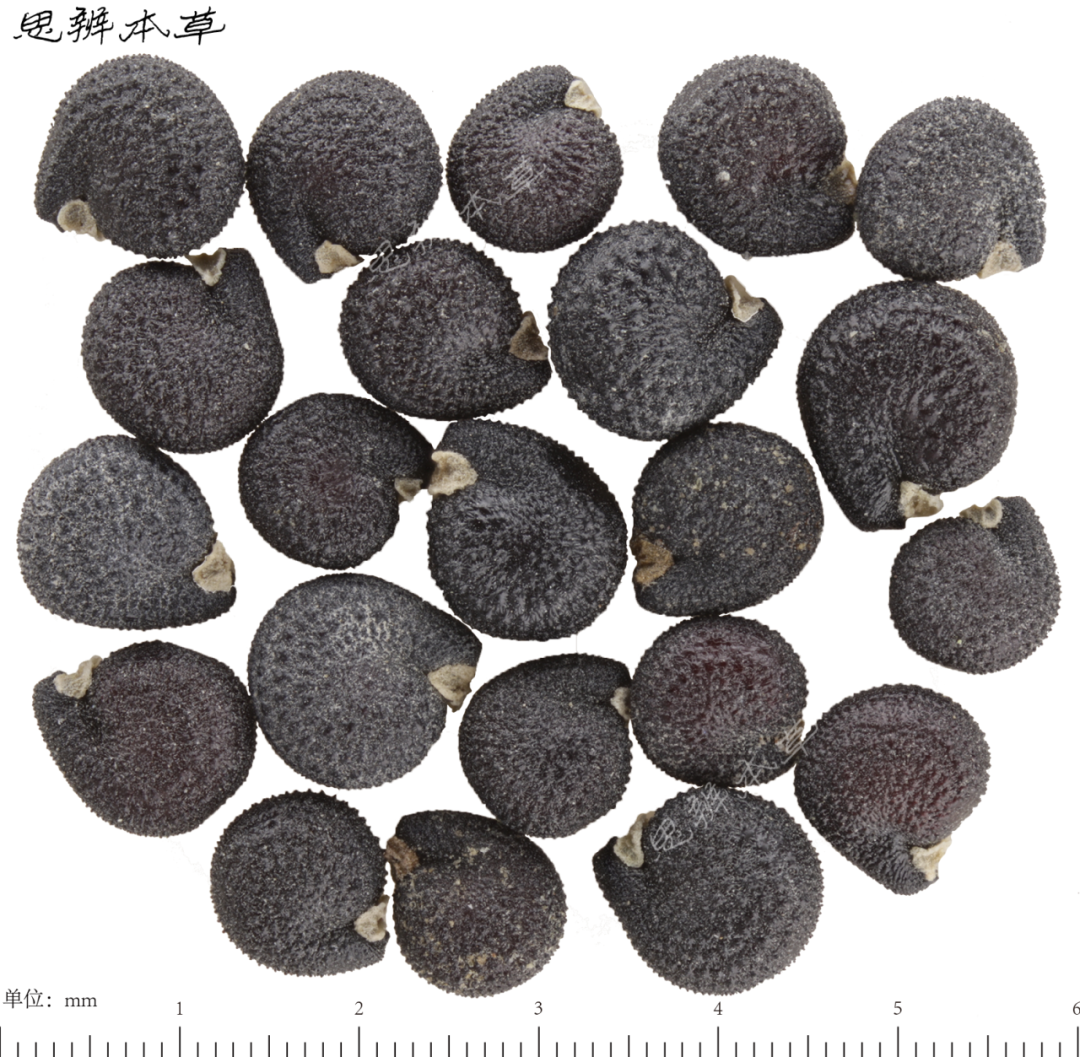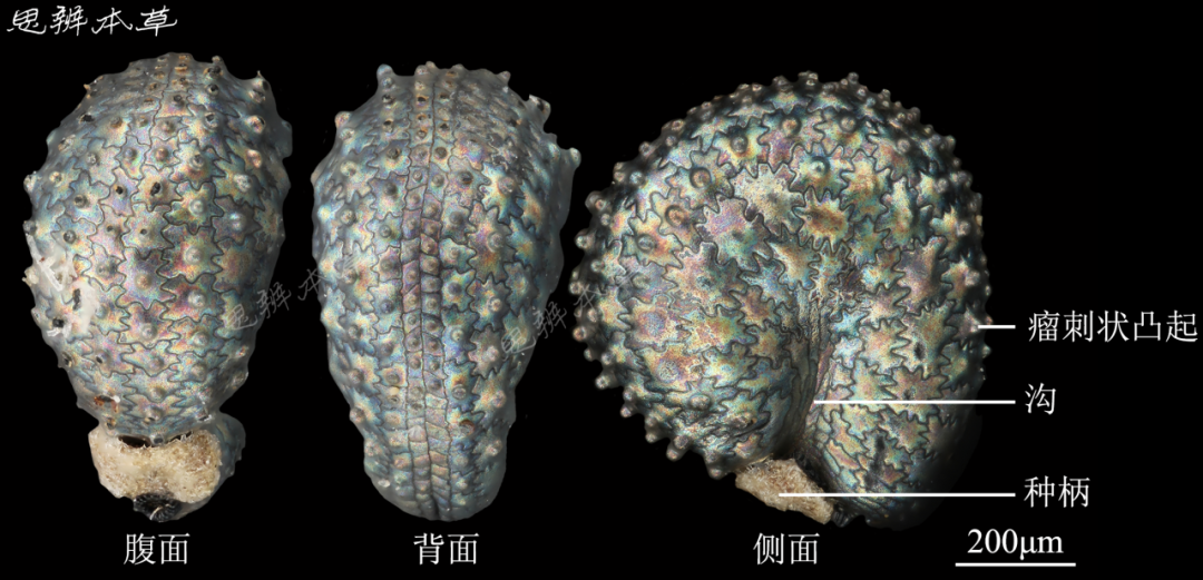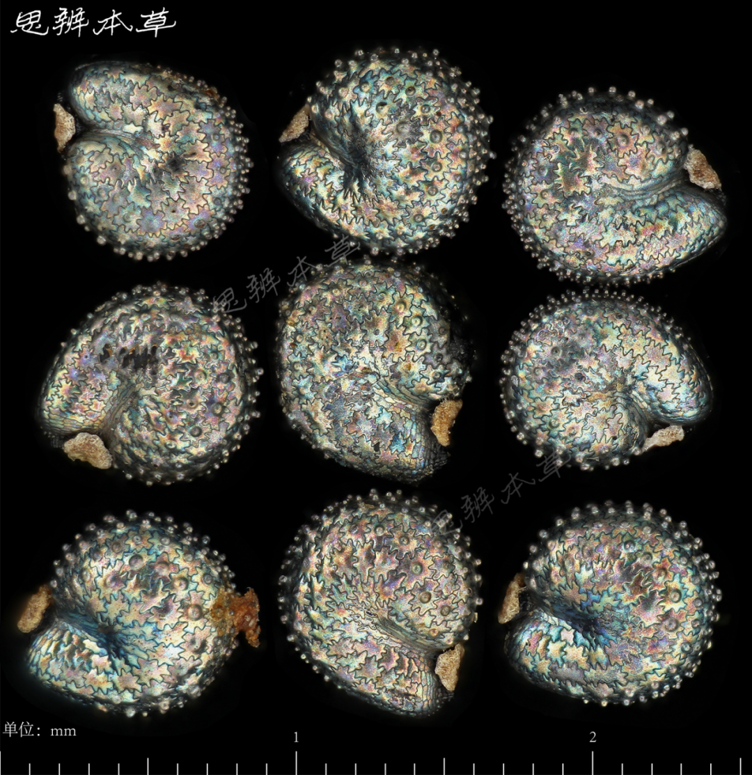 细小,肾状卵形或三角状圆形,两侧扁,长 0.7~0.8mm,宽 0.6~0.7mm,厚约 0.4mm,银灰色。解剖镜下观察,有彩色光泽,背面及近背侧面密被瘤刺状凸起,并排列成同心圆状,背面中央有 1 或 2 列的凸起小而密,其余凸起较大。两侧面中下部各有 1 沟,通向种脐。种脐在腹面基部凹口处,略呈横长方形;外被淡黄色种柄。种皮质硬而脆。胚乳粉质;胚环状,乳白色,环绕胚乳。千粒重 0.093~0.098g。
