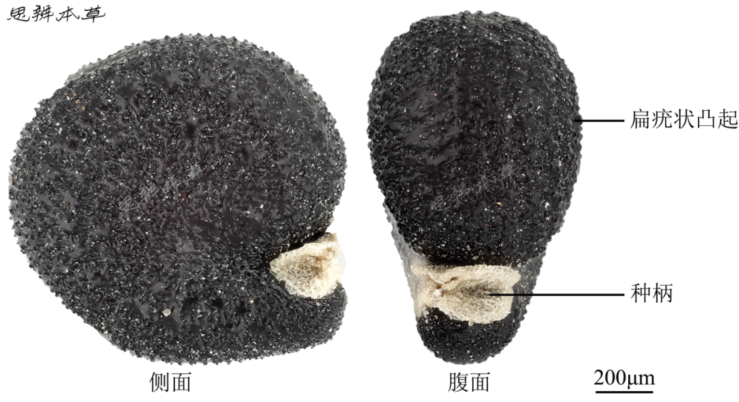 细小,倒卵形,略呈肾形,扁平,长 0.7~0.8mm,宽 0.6~0.7mm,暗银灰色,略有光泽。解剖镜下观察,表面密被瘤刺状凸起,呈同心圆状排列。两侧中下部各有 1 沟,通向种脐。种脐位于基部凹口处;外被淡黄色种柄。