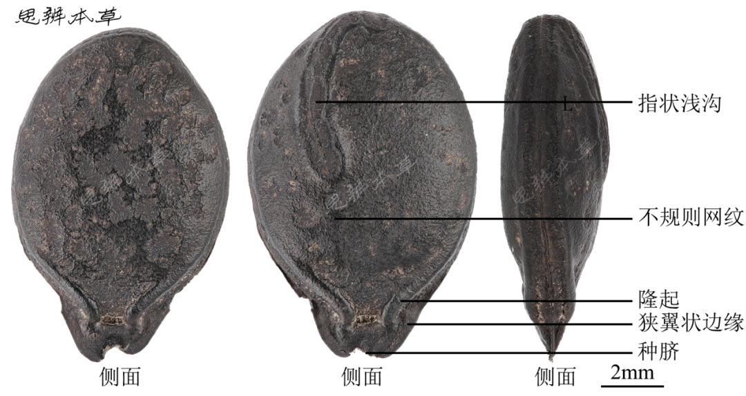 扁椭圆形,长 10.5~12.8mm,宽 8.4~8.9mm,厚 2.6~ 3.1mm,黑褐色至黑色,无光泽。解剖镜下观察,表面平整,密布略凸起弯曲的线纹,边缘具狭翼。顶端钝圆,基部微凹陷处为种脐,两侧面较平,近基部各具 1 对叉开的披针形隆起。种皮外层硬,木质;内层灰绿色,膜质。胚直生,白色,有油性;胚根短小;子叶 2,肥厚,椭圆形。千粒重 69g。