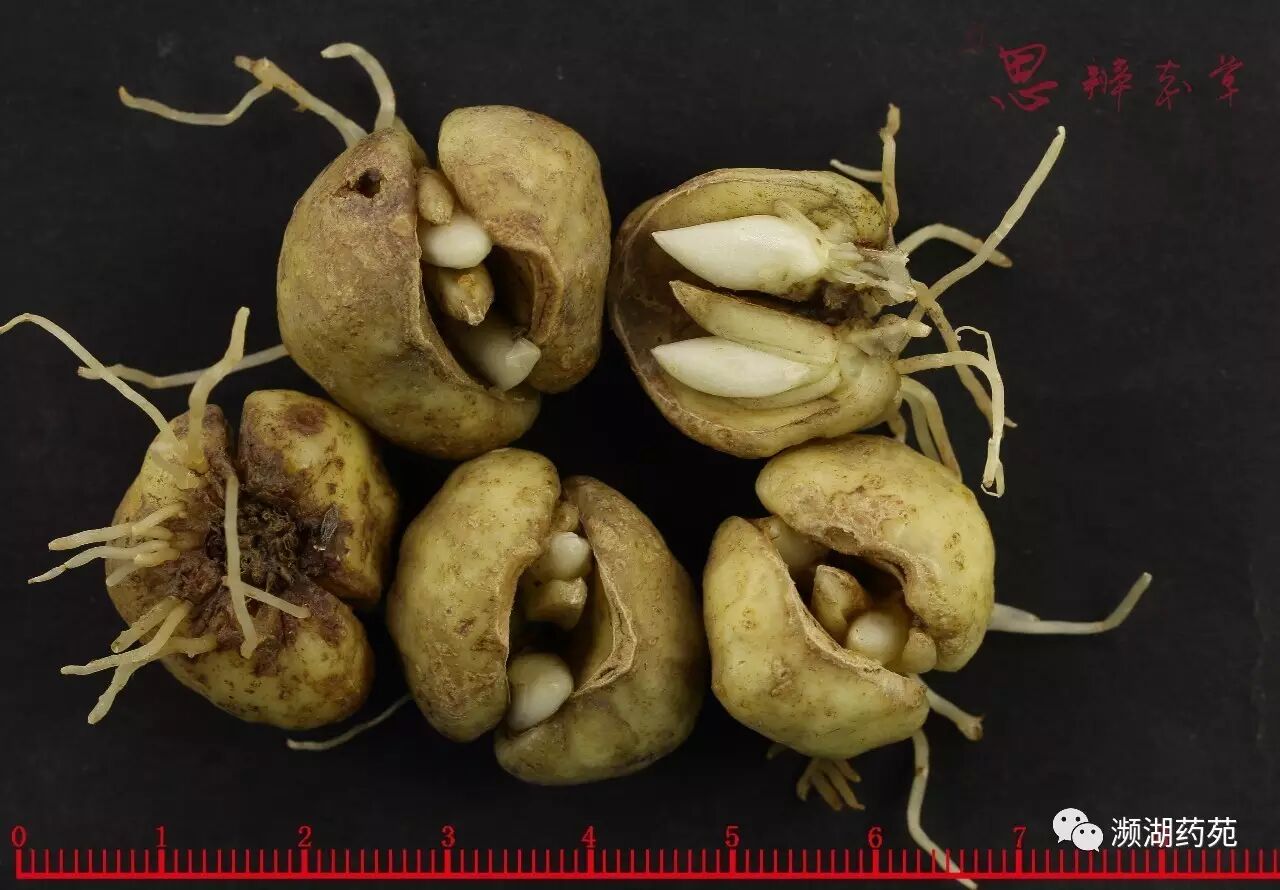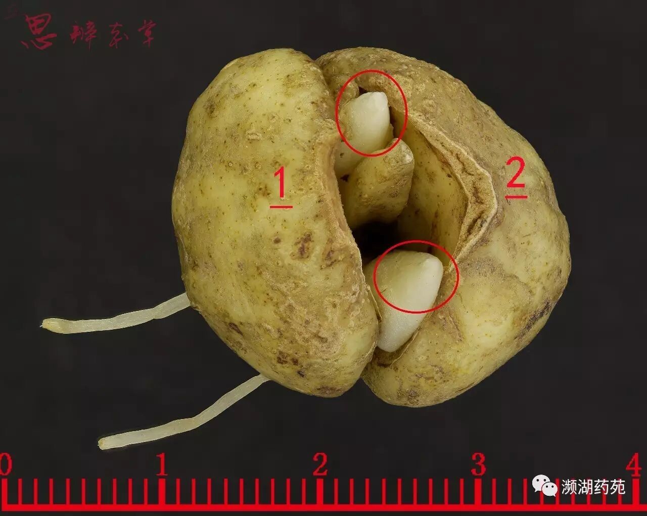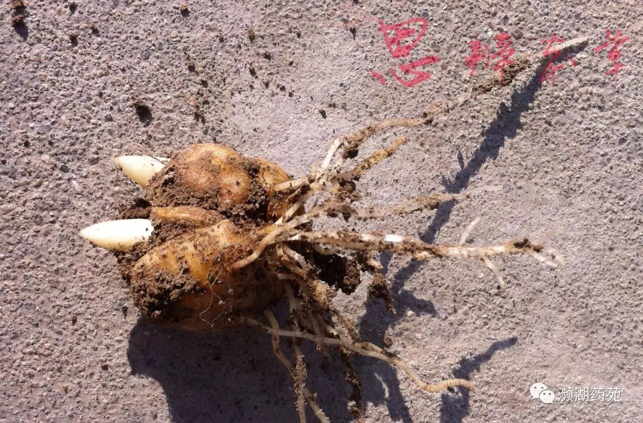 浙贝母新鲜鳞茎形态,鳞茎扁球形,鳞片2-3瓣(少数4瓣),鳞茎下部着生数十条须根,图中已能看到白色的心芽,同时须根开始生长,这个阶段大约是在11月份,这样的鳞茎已不太适合进行种植了。浙贝母的种植一般是在心芽未完全分化形成,须根少或无的时间进行。