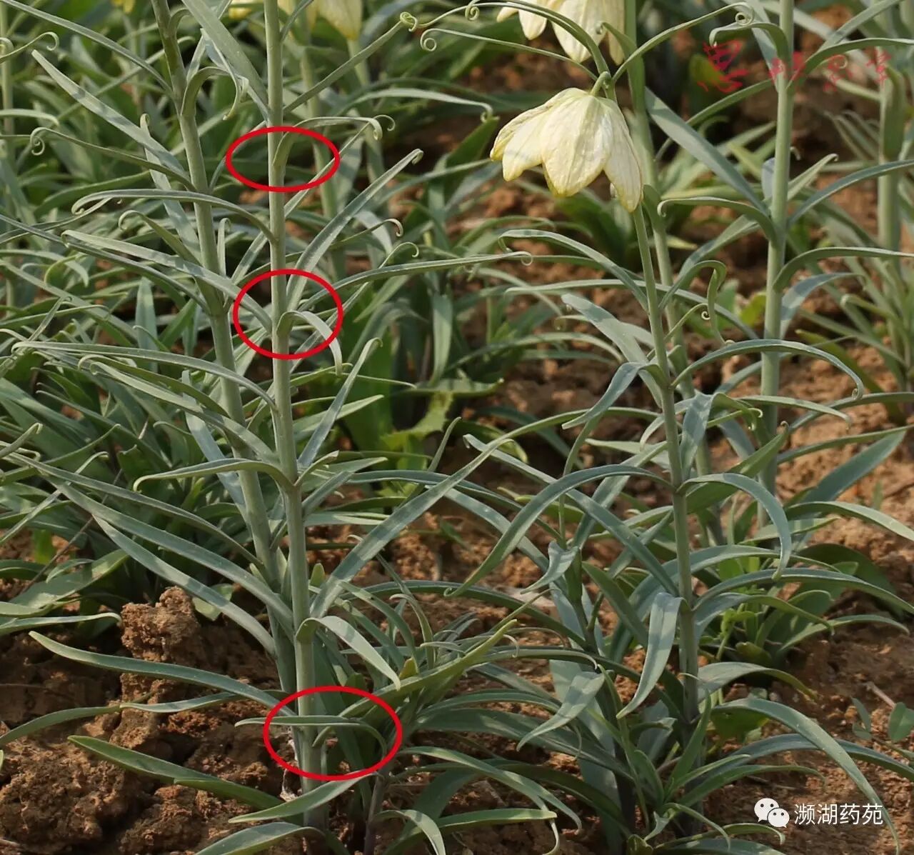 浙贝母下部茎叶,自上而下3个红圈中叶片分别是互生、轮生、对生。