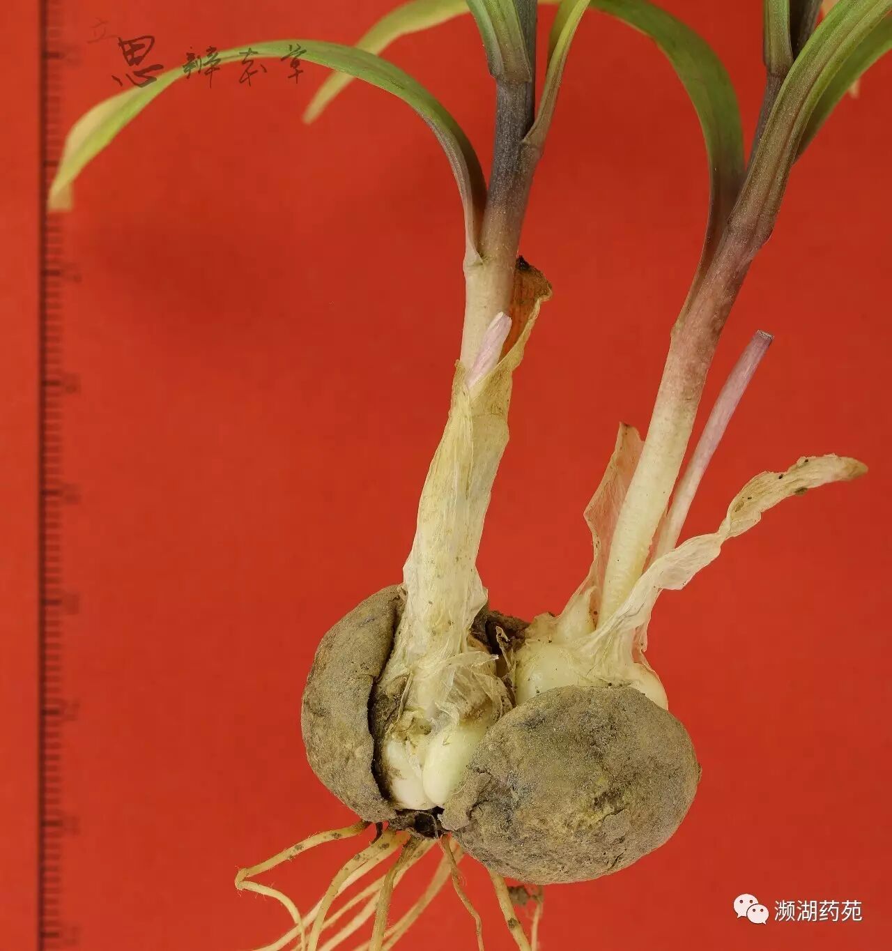 浙贝母生长中期,拍摄于3月下旬,此时气温逐渐回升,浙贝母生长迅速,也是施肥和增产的关键时期。外层2片为老鳞叶,中间包埋着2个新鳞茎,为浙贝母生长中期。