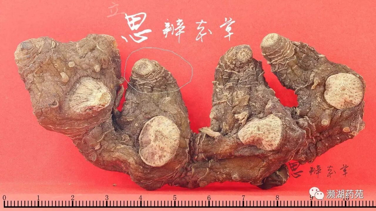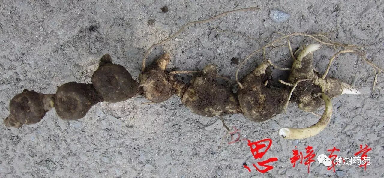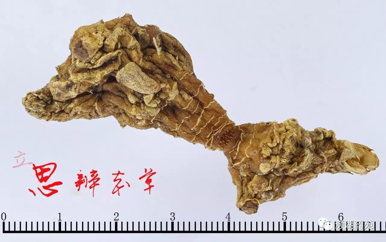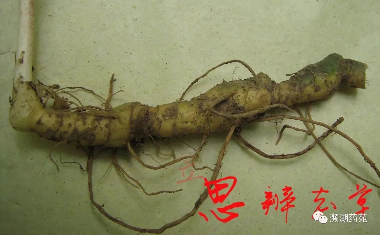上图示鸡头黄精放大形态,每1节根茎上都有一个短分枝(分歧状),波状环节明显,一端粗一端细,细端较长,似鸡头。