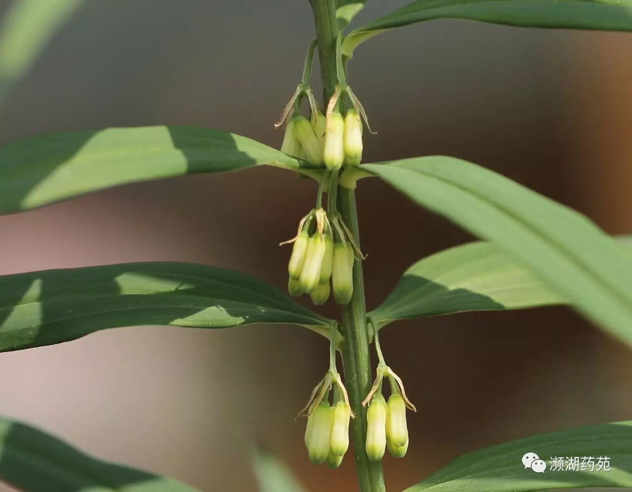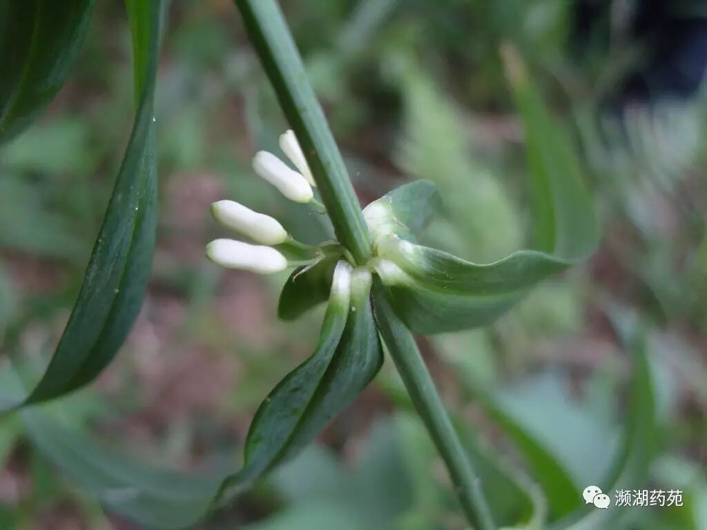 最后介绍多花黄精,因花丝顶端有囊状突起也叫“囊丝黄精”,根茎略扁呈姜块状,药材称为“姜形黄精”。植株高50-100厘米,小于滇黄精,叶互生,椭圆形或卵状披针形,花腋花,每个花序有花3-5朵或更多,果实比黄精(鸡头黄精)大,较滇黄精小。