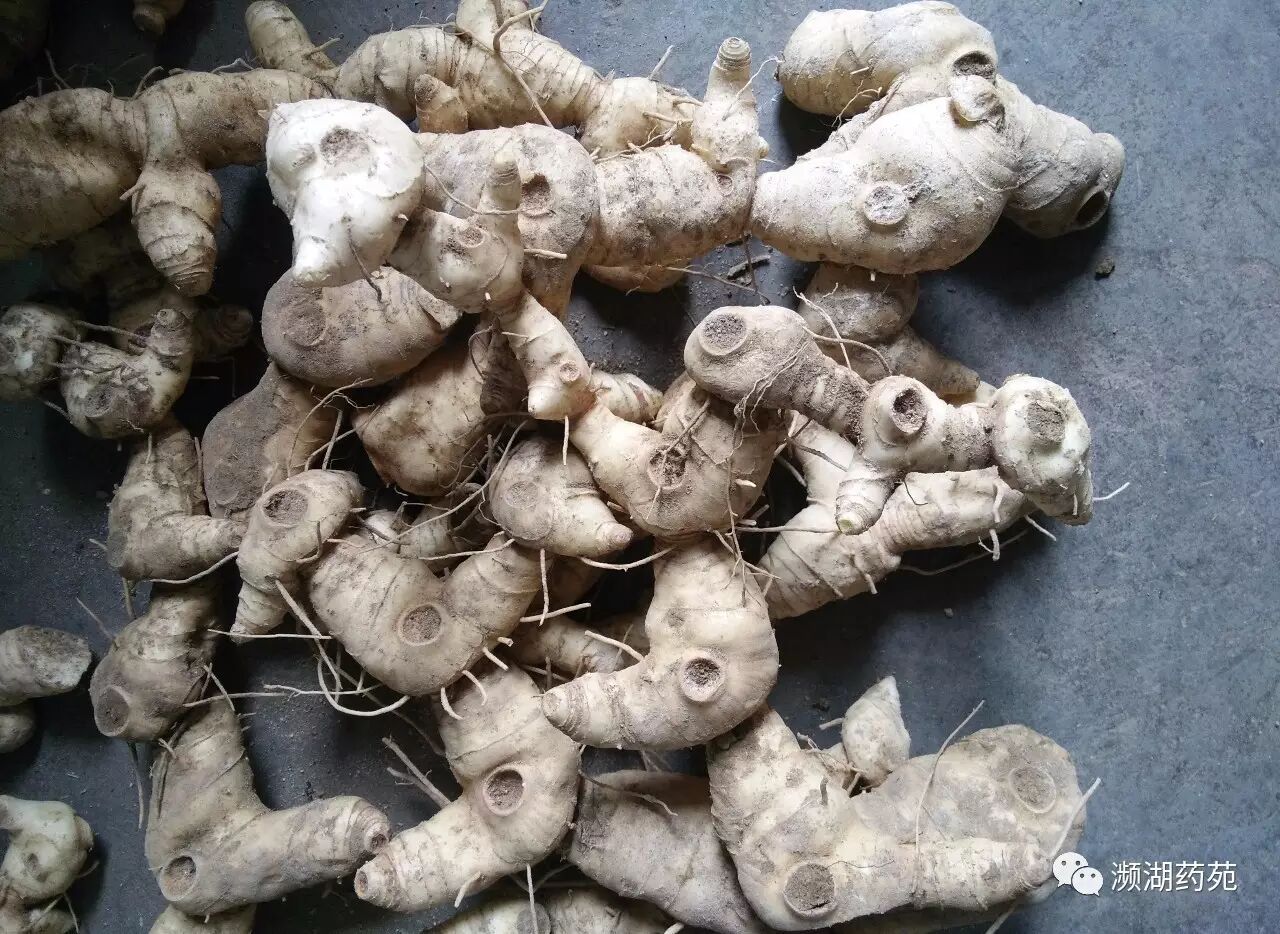 上图示多花黄精(姜形黄精)新鲜根茎,根茎状如姜块,图中茎痕粗大,与节相对比占比大,是3种黄精中茎痕最显著的种类。