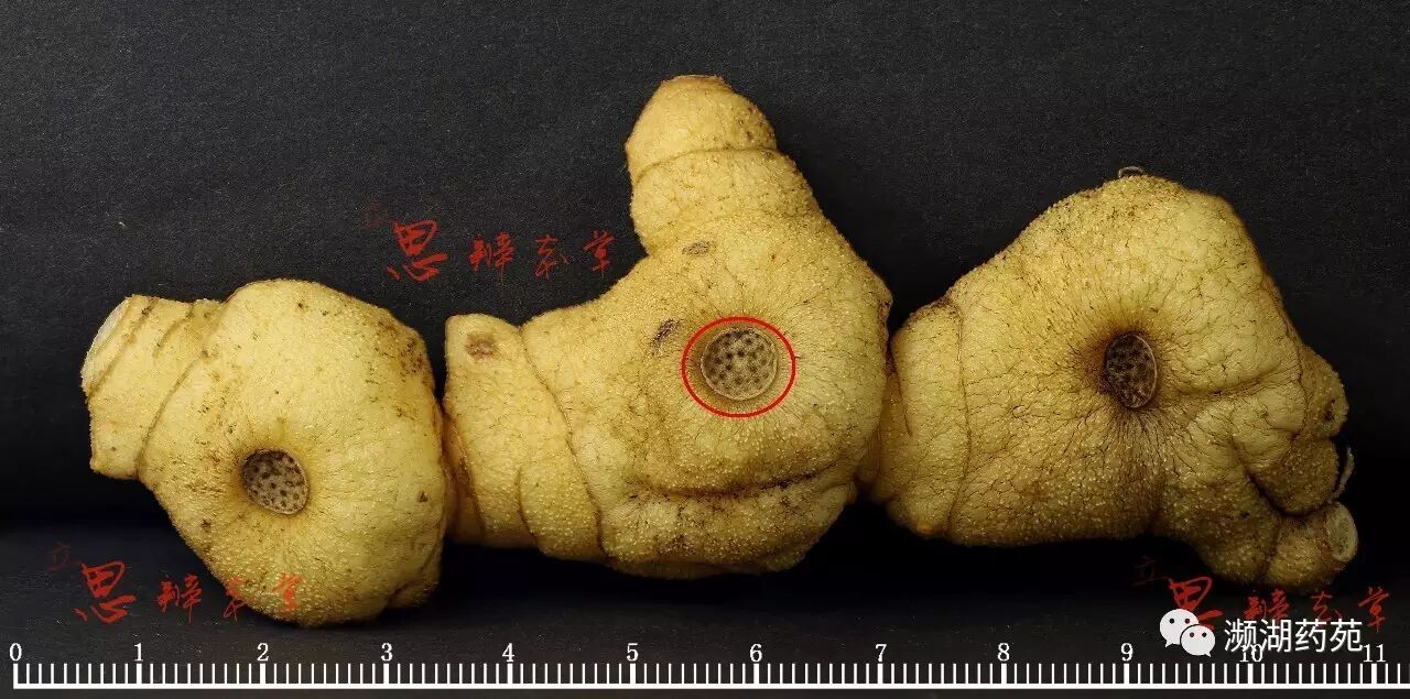 上图示为滇黄精新鲜根茎,正面,红圈中为茎痕,茎痕较小,尤其是与节对比,是3种黄精中相对比例最小的。