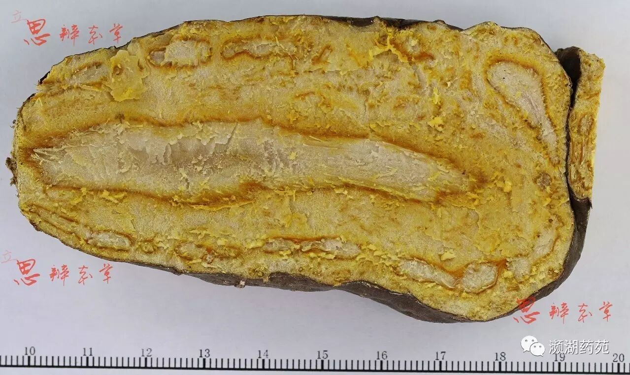 上图为制首乌,临床上看到的何首乌药材均为这种形态,因为生何首乌毒性大,故很少使用,必须经过炮制方可配方使用。炮制过后若是切厚片则仍然可根据木质部结构来判断云锦花纹的形态和数量。若切成方块则不利于鉴别生长年限。