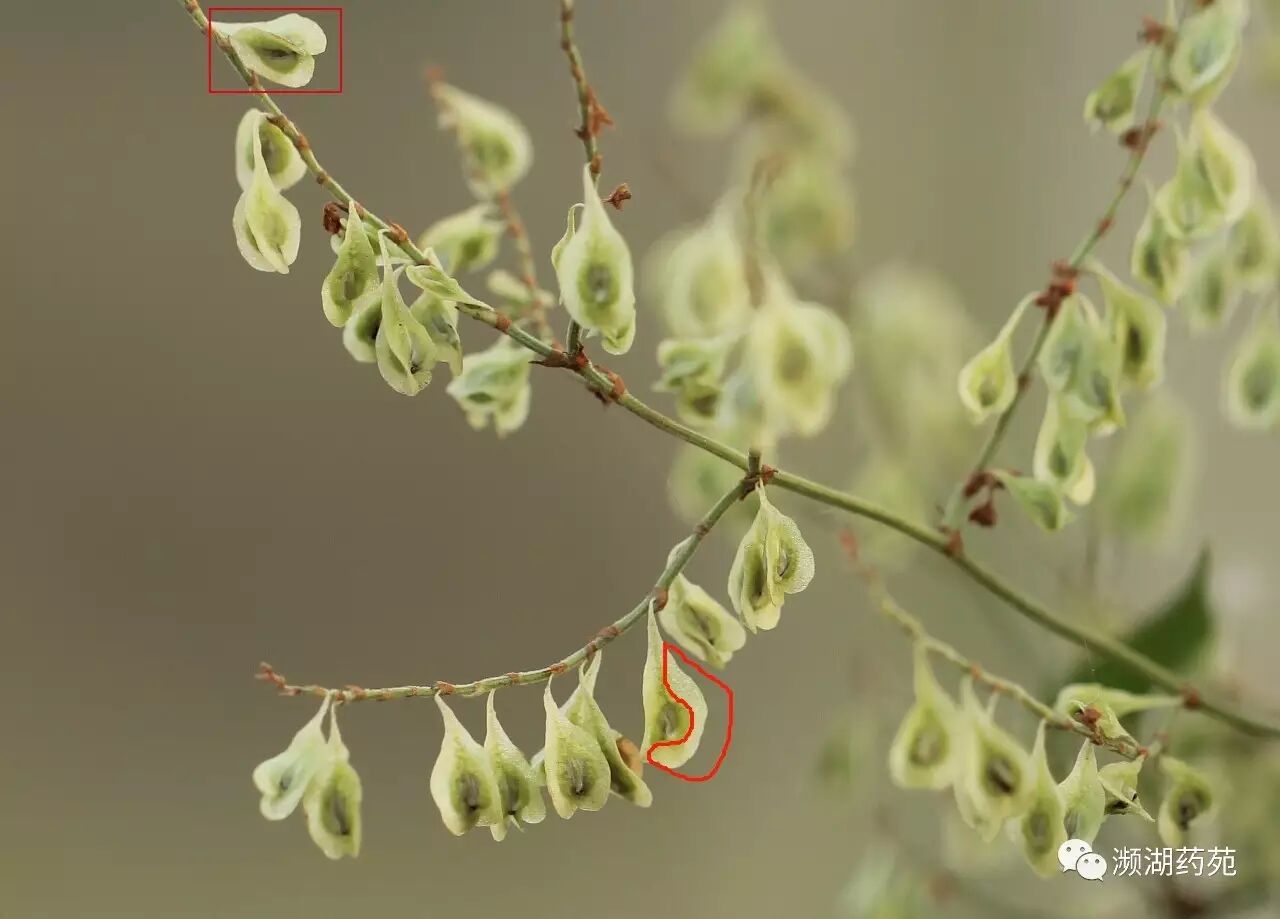 上图为果实,红色方框中为单个果实,呈三棱;上图下方红色圈内为宿存的花被片,翅状。