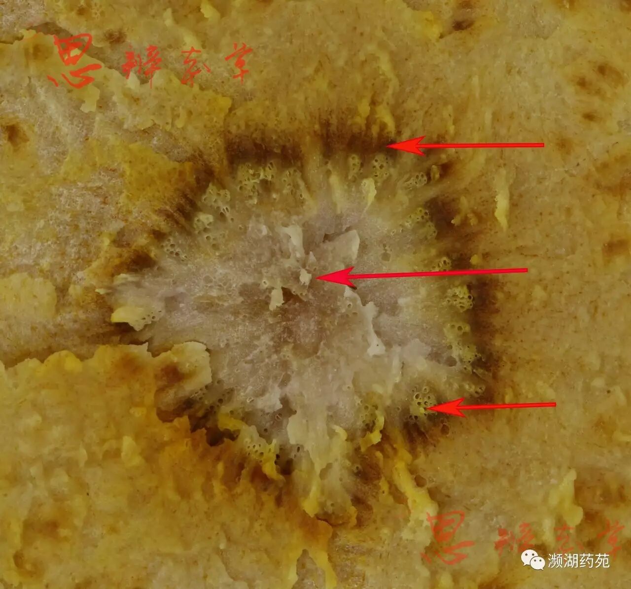 上图为何首乌横切面中心放大形态,从新鲜形态可大致分辨显微结构。图中上一个箭头指示的为韧皮组织,中间箭头指示的是初生木质组织,下一个箭头指示为木质部导管。