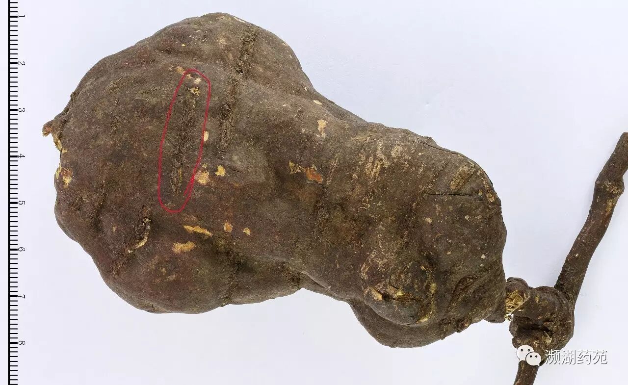 上图为何首乌新鲜的块根,纺锤形或团块状,红色圆圈内为横长的皮孔,表面红禢色。