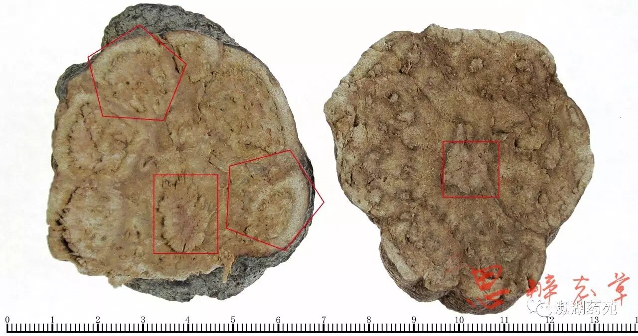 上图为新鲜何首乌横切面,鲜黄色,多边形方框中即为异型维管束,也称复合维管束,数量通常是4-11个,也有超过11个的,上图正好是11个,干燥之后我们称之为“云锦花纹”,这种花纹数量多则可判定其生长年限较长。四方形框中为正常维管束。