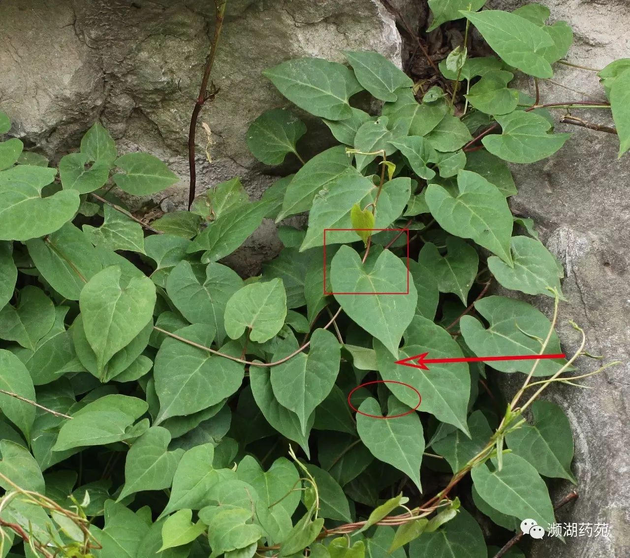 上图中红色方框中叶为叶基部,呈箭形;红色椭圆形中叶基部为心形;箭头所指为叶前端,渐尖;叶中间主脉白色较突显。
