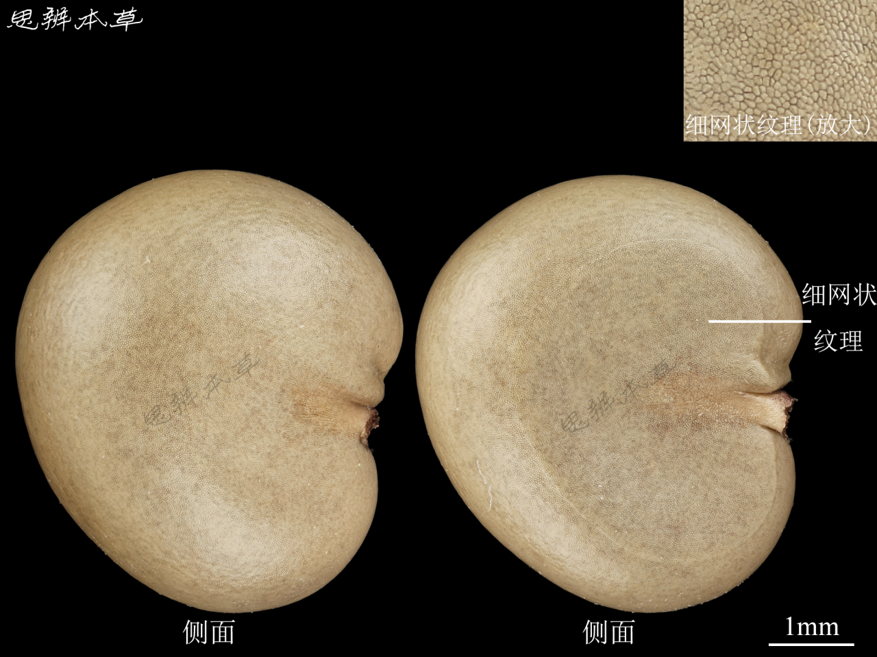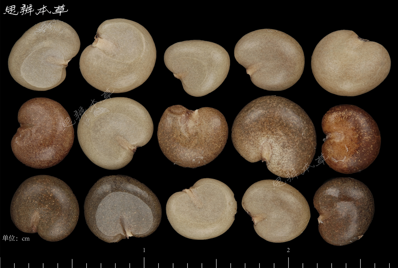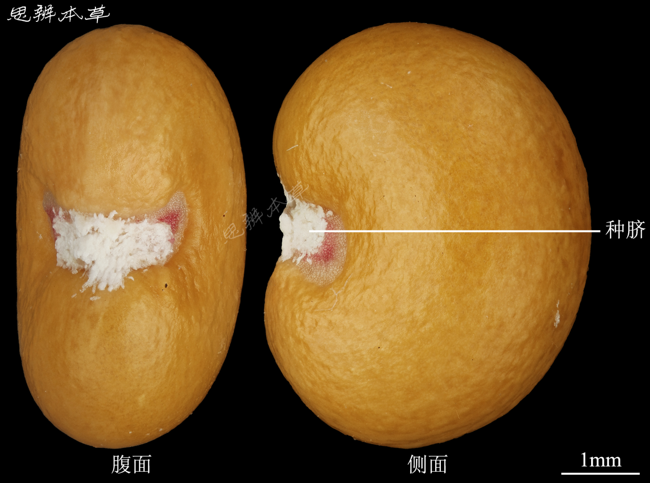 肾形或肾状椭圆形,长 4~6mm,宽 3~5mm,厚约 2.5mm,灰白色至棕褐色,有光泽。表面光滑,多一面压平,一面隆起,解剖镜下观察,具明显的细小网状纹理。种脐位于腹面凹陷处,灰白色。胚乳丰富;胚小,直立。千粒重 5g。