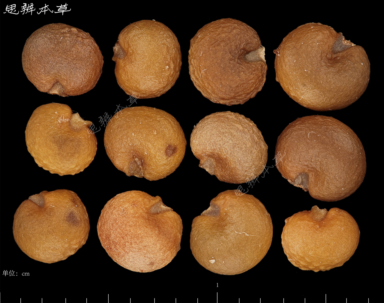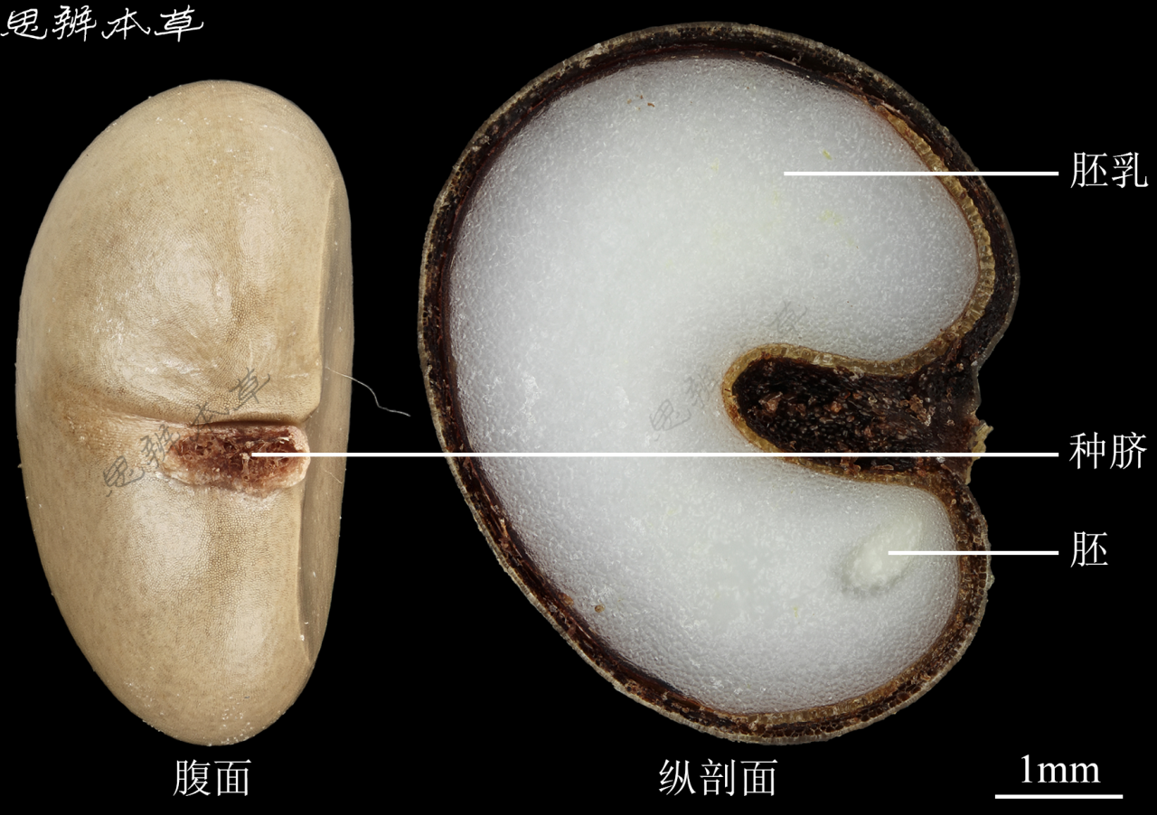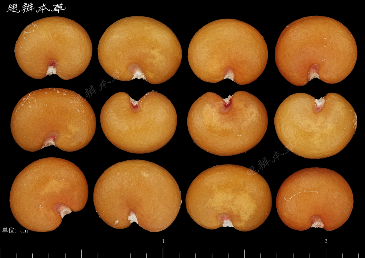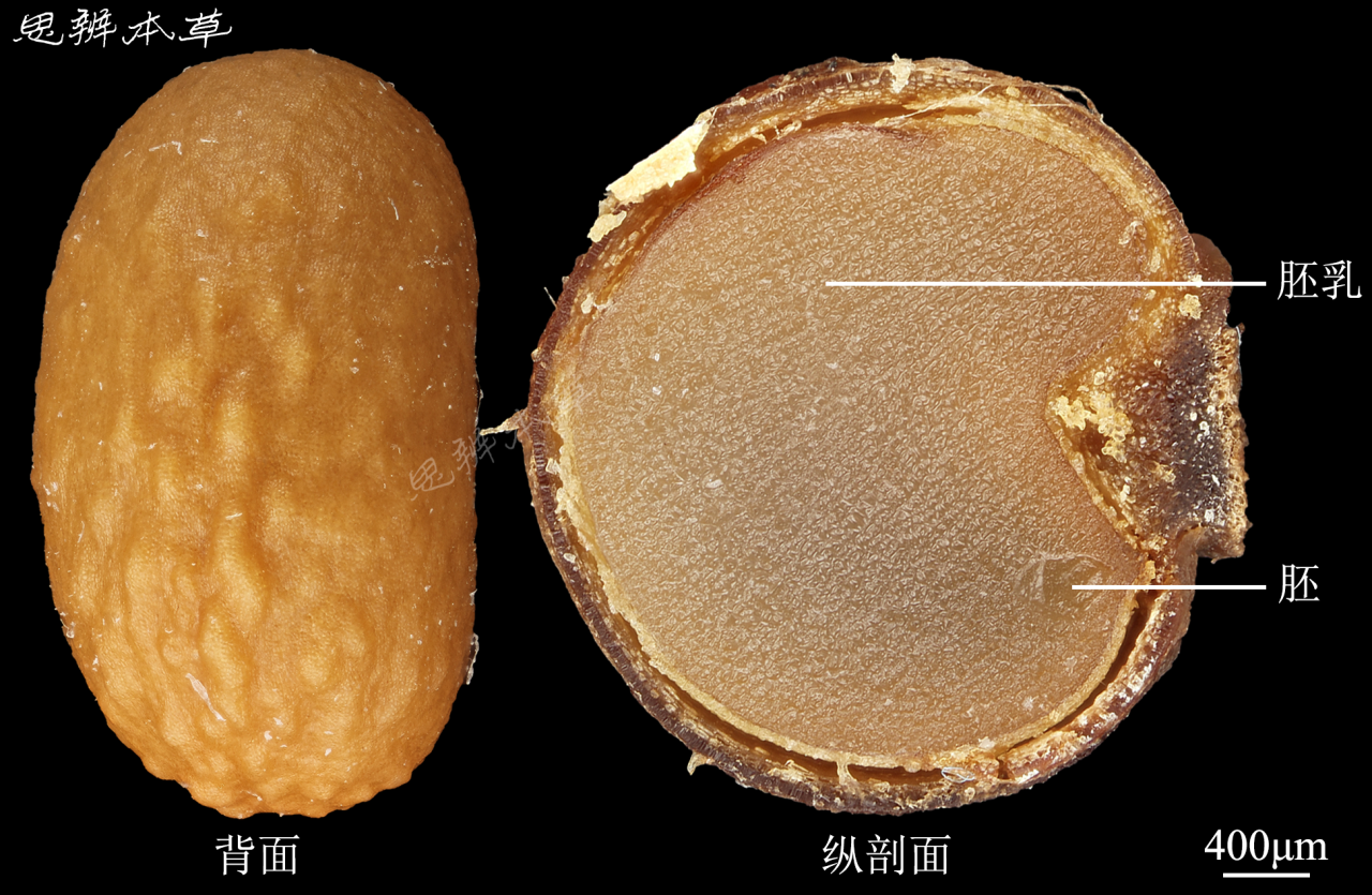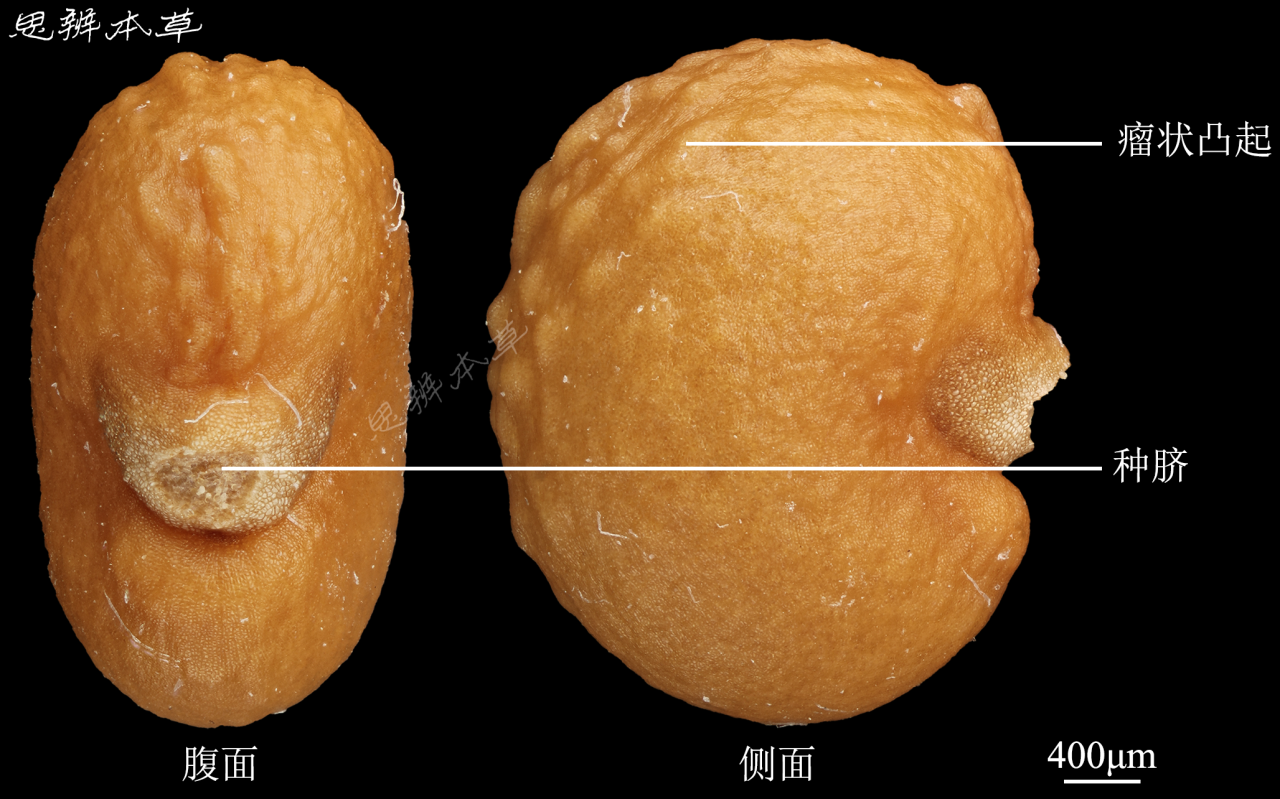 肾形,长 3~4mm,宽 3~3.8mm,厚 2.5~3mm,棕色或黄棕色,微有光泽。解剖镜下观察,表面有明显瘤状凸起。种脐位于腹部微凹处,斜“V”字形,长约为种子宽的 1/3,灰棕色。胚乳丰富;胚小,直立。千粒重 5g。