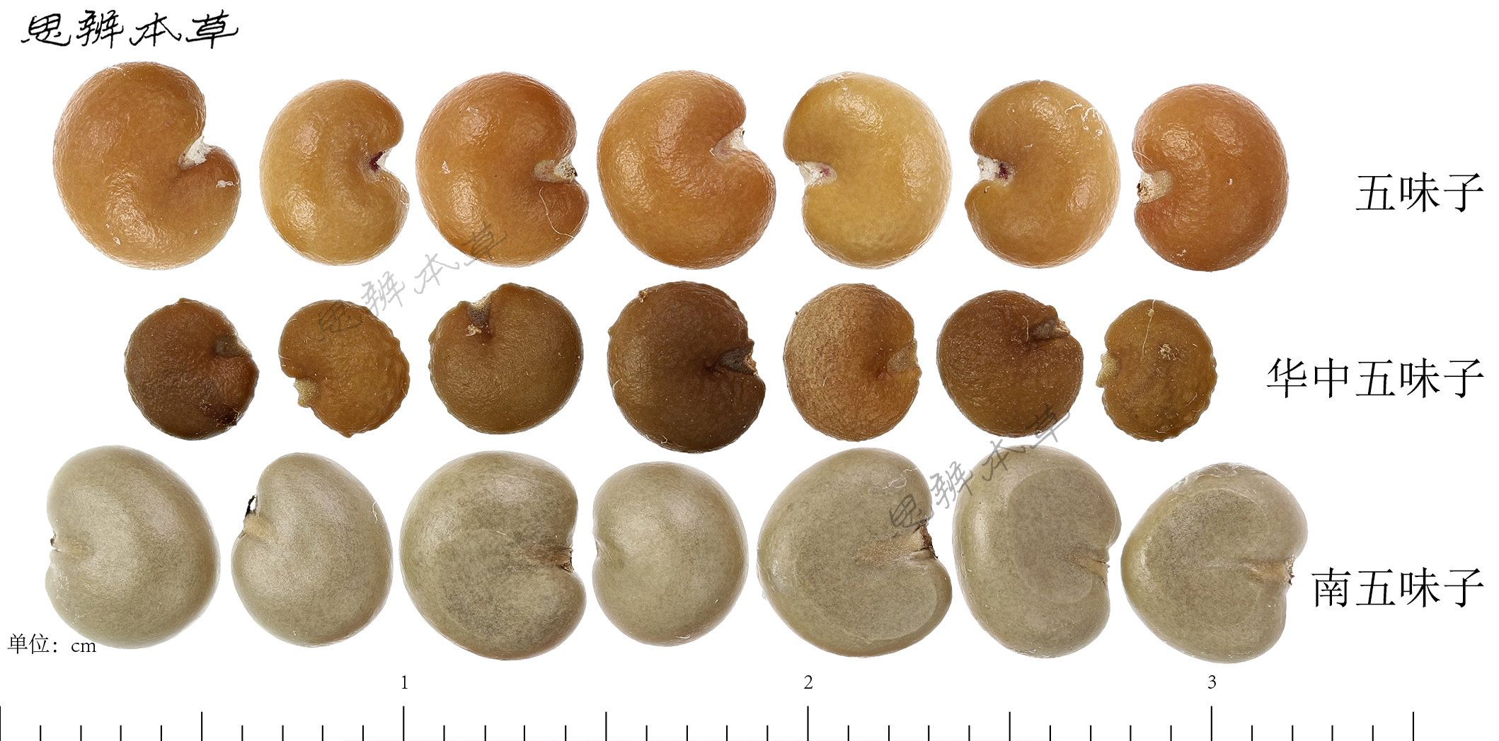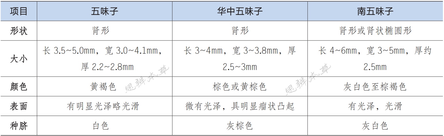 五味子与华中五味子为同属植物,两者种子较为相似,其中前者籽粒较大,表面有明显光泽,略光滑;后者籽粒较小,表面微有光泽,有明显的瘤状凸起。南五味子的种子与前两者明显不同,表面灰白色,有光泽且十分光滑,侧面常平截。