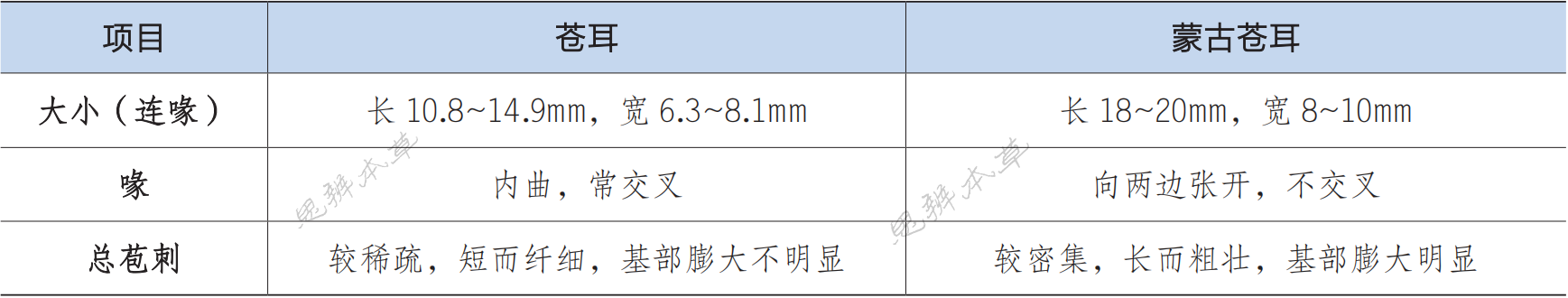 两者种子(带总苞果实)主要区别是苍耳个头略小,总苞刺较稀疏,较短,喙常内曲或交叉;蒙古苍耳个头略大,总苞刺密集分布,较长,喙不交叉。
