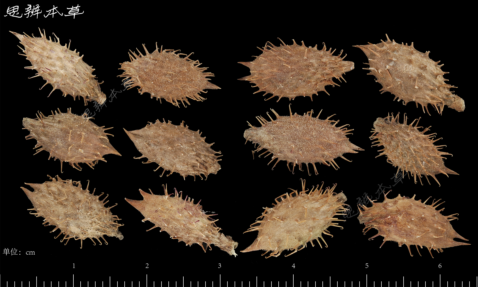 囊状总苞椭圆形,长 10.8~14.7mm,宽 6.3~8.1mm,黄褐色。表面疏生钩刺,短而纤细,基部膨大不明显,末端倒钩状,刺间无纵棱,疏被细毛,长 1.2~1.7mm。解剖镜下观察,总苞表面密生短茸毛和疣状凸起。顶端具 1 或 2 内曲且常交叉的喙,基部为 1 圆形总果柄痕。总苞坚硬,木质,2 室,每室瘦果 1。瘦果椭圆状披针形,灰黑色。表面具 10 条稍隆起的纵脉。果皮薄,内表面银灰色,有光泽。种子椭圆形,淡褐色,稍有光泽。种皮薄膜质。胚直生,白色,含油分;胚根短圆柱状;胚芽明显;子叶 2,肥厚,椭圆状卵形。千粒重(带总苞瘦果)26~36g。